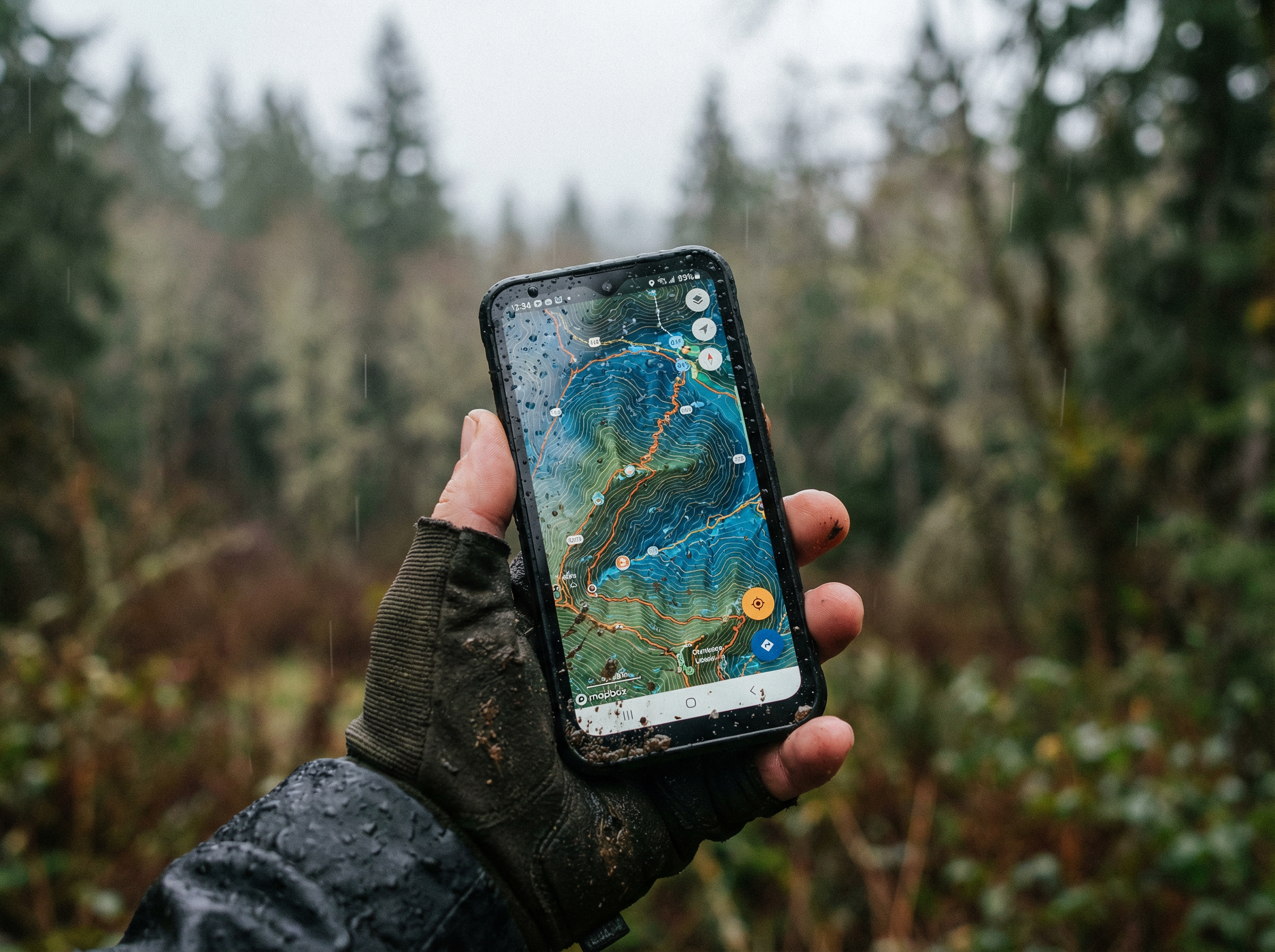 Digital compass with bearing, altitude, and coordinates. No calibration headaches — works immediately in airplane mode.